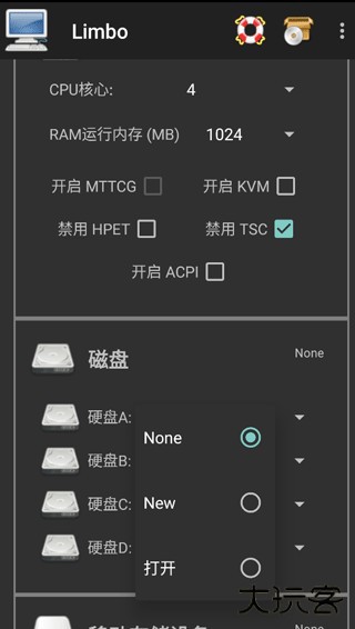 9、这里当你点击磁盘A后面的None时,会弹出小窗口,这里要选择打开而不是New。New是新建一个空镜像,而打开则是手机自带或者limbo内置的文件管理器,让你选择镜像。