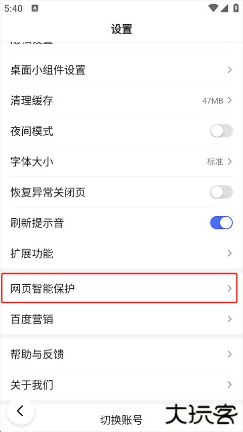 在“我的”页面,点击右上角的三横小齿轮图标或“更多”图标;或者直接点击页面中的“设置”选项。 找到“网页智能保护”。