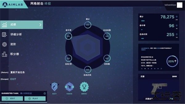 每次训练时都有清晰的数据展示,能实时看到打中了多少目标、用了多长时间反应这些关键信息,还配有图表让你观察自己表现的起伏变化。结束一次练习后,会生成一个六边形能力图评估报告,比如快速反应得分、跟枪精准度评估、移动速度分数等,让你一眼就能明白自己哪个环节需要加强。