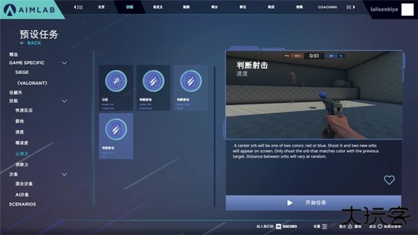 工具提供了 15 种不同的训练项目,覆盖了 6 大核心能力:打的准不准、操作速度快不快、追踪目标稳不稳、反应判断灵不灵、需要立刻行动时的反应、不易被察觉物体的发现能力。训练场景能模仿好几款射击游戏(比如《CS:GO》、《瓦洛兰特》、《APEX 英雄》)的操作手感,切换练习内容也很方便。