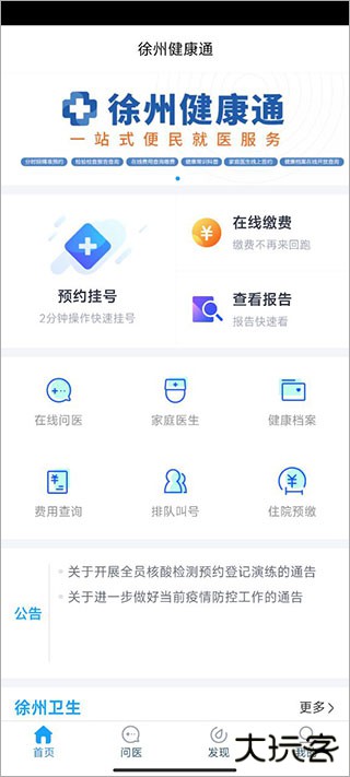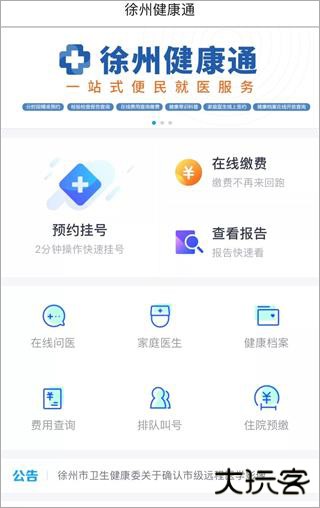 1、下载安装徐州健康通,运行软件,在首页,有再现文艺、家庭医生、预约挂号、在线缴费、健康档案等;