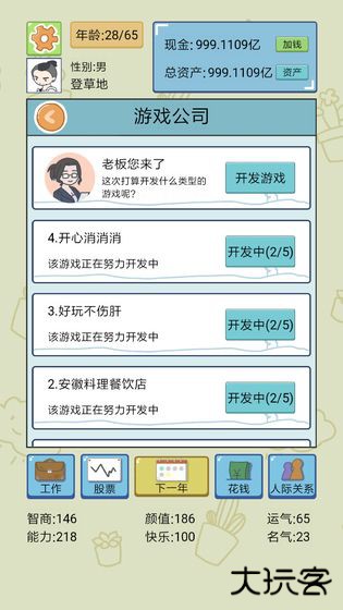 2、幼年阶段任务以学习发展为主,通过年份推进按钮快速度过初始年份,系统每年自动恢复体力值用于校园活动提升角色属性。成年期将解锁多维社会活动板块,涵盖医疗健康管理、婚恋社交、休闲娱乐等中国特色生活场景,深度体验现实社会的人生百态。