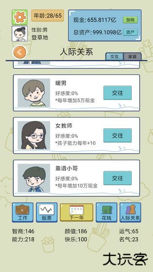 2、升职加薪和生养规划才是重头戏呢,工作初期从基层岗位做起多加班两年保证升职效率,名声靠捐款累积,情商颜值智力这些属性用普拉提健身刷刷就好了;相亲时用高级红娘重点锁定超模或巨星找高颜值对象,选富豪总监刷智力就对了。至于生孩子的事,一个就够别多生或领养,从 3 岁起全力培养属性满值,第三代就能轻松当上顶流主播或总监了;再加上 VIP 免费看视频、健康值拉满加班、和父母兄弟姐妹处好关系拿遗产这些小细节,游戏跑起来可就顺畅多了!