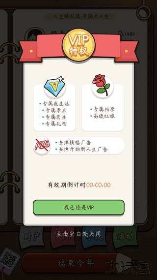 1、该游戏高度还原人生历程的阶段性特征,玩家将完整经历从幼年到老年的成长进程。破解操作便捷:点触界面右上角拉环图标进入 VIP 功能页,连续点击底部视频区域五次即可免广告激活权限。