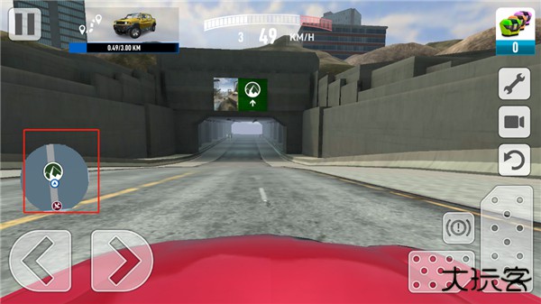 4、赛道加载完毕进入驾驶界面,观察操作控制区域:屏幕左方为虚拟方向盘,用于控制车辆行进方向;屏幕右方配备油门(通常为圆形按键)与刹车(通常为条状控件)虚拟按键。