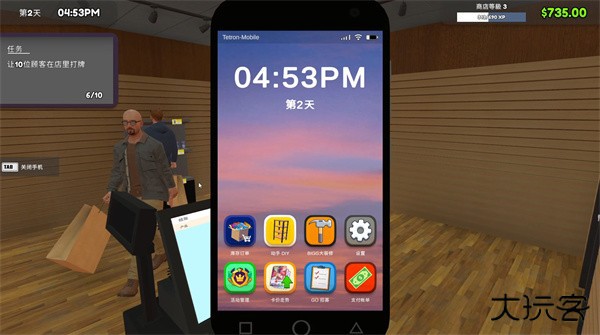 按下Tab键开启手机,玩家就能通过网上购物送货到家服务,购买置物架和卡包售卖赚钱