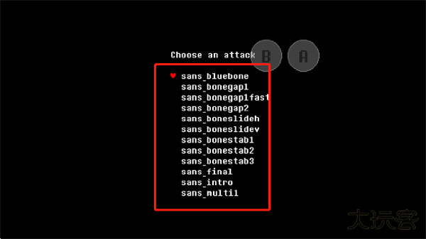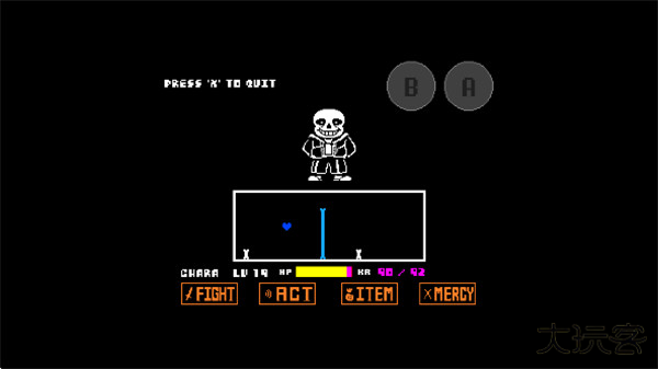 6、下图皆为“sans_bluebone”地图下的表现,触碰蓝色骨刺可恢复血量,触碰白色骨刺将失去血量。