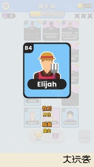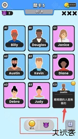 2、每个关卡都会有一张卡牌是公开的,玩家通过第一张卡牌给到的信息进行推测,选择下方的好人/坏人点击其他卡面;