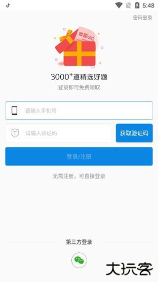 1、下载安装考试资料网app,并且打开软件,输入手机号、验证码即可直接进行登录;