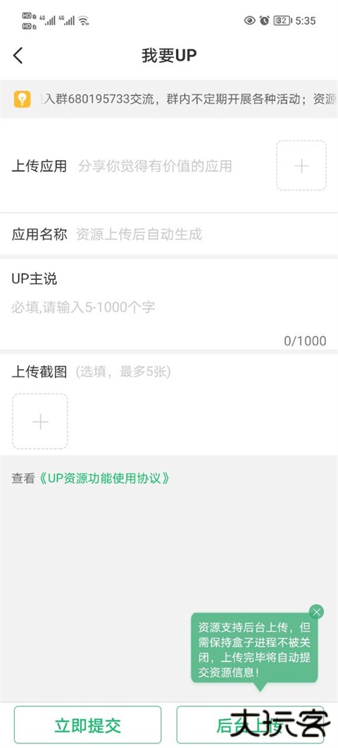 2、填写好相关的信息,后台上传完资源之后立即提交即可