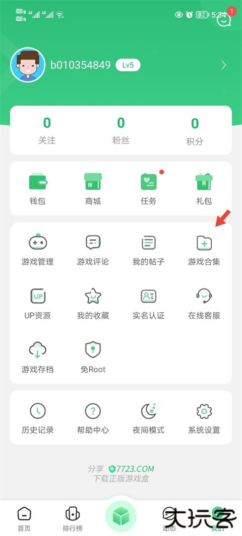 1、打开7723游戏盒app,点击右下角我的,找到并点击游戏合集