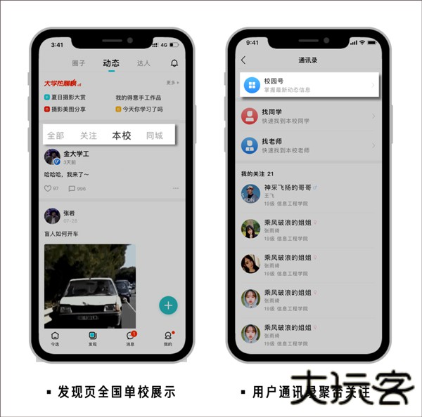 覆盖官方信息发布、社团活动、校园二手、失物招领、表白墙、万能墙、迎新报道、考研四六级、招聘会等多个高校生活、学习、就业场景。