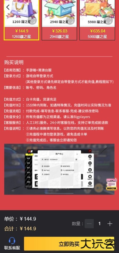 第一步:进入Bigplayers充值平台,港澳台服充值的商品都有对应的价格介绍,选择最自己想要的充值金额即可!