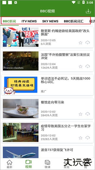 2、软件首页功能最新栏中包括bbc新闻、bbc六分钟英语、bbc新闻词会等