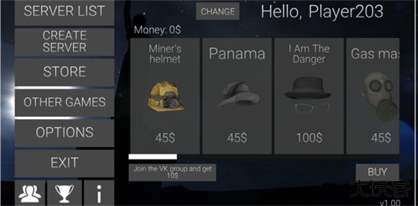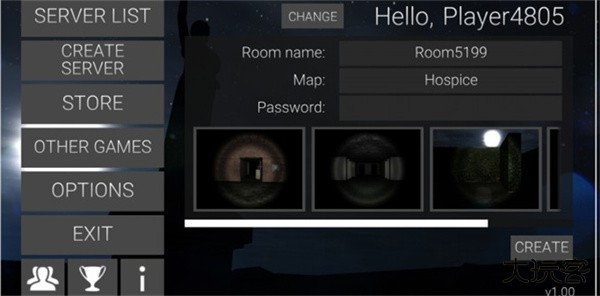 1、首先我们进入瘦长鬼影计划online手游联机版,游戏界面第一个是房间大厅,第二个是创建房间,第三个是道具购买,其他可以不管!