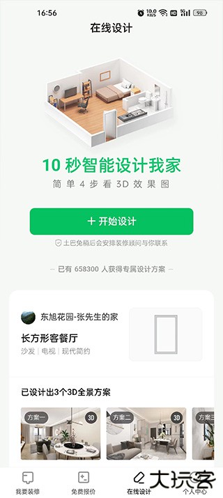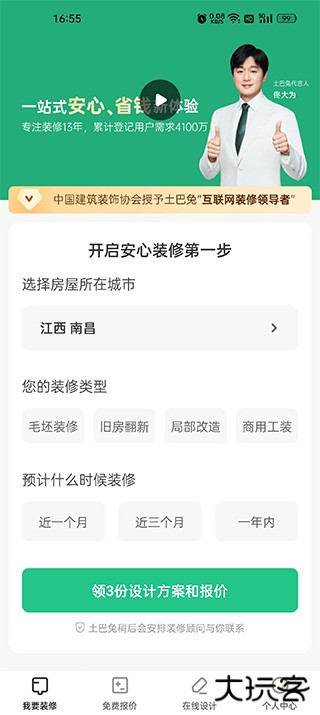 1、在本站下载安装软件,注册登录来到软件首页,在首页填写自己房子的类型可以领三份设计方案和房子装修报价