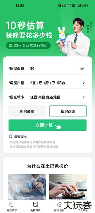 2、点击免费报价,将房子的面积以及户型填写在软件内,可以计算房屋装修的花费