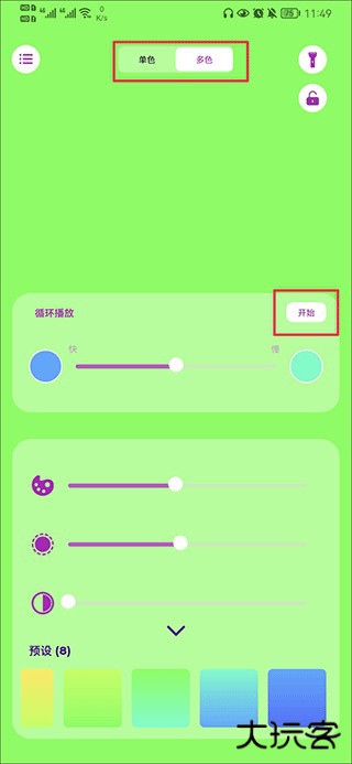 4、点击上方切换至对色模式,选择颜色后,点击“开始”,系统会根据颜色深浅动态变化,呈现渐变光效。