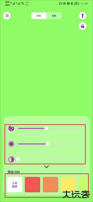 3、完成颜色调整后,点击屏幕隐藏所有工具,使灯光更加纯净,避免干扰视觉效果。