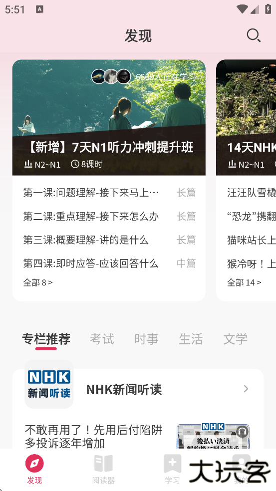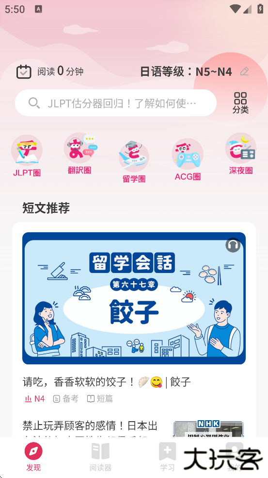 1、提供N1-N5分级内容库,涵盖新闻、轻小说、漫画等日文原版素材,根据用户水平智能推荐阅读材料。