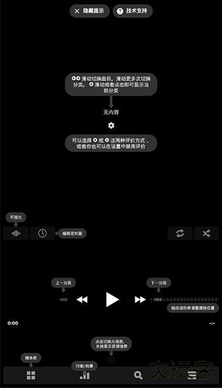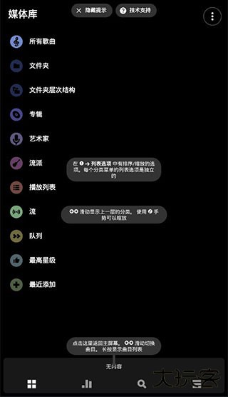 1、这里是poweramp的主界面,你可以在这里完成滑动切换曲目、滑动更多次切换分类等操作,你还可以通过滑动或者点击来显示当前分类。