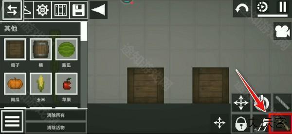 2、进入游戏如图,点击左上角菜单按钮,添加两个物品在地上;