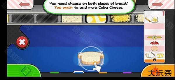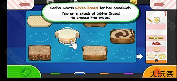 4、在挑选完所需要的食物之后,点击面包片食物就会自动放在面包上,最后只要点击右下方即可制作三明治。