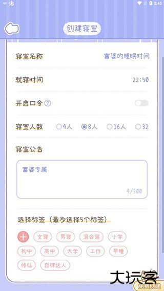 4、再输入寝室名称、就寝时间、口令、人数、公告,选择标签就可以创建寝室了。