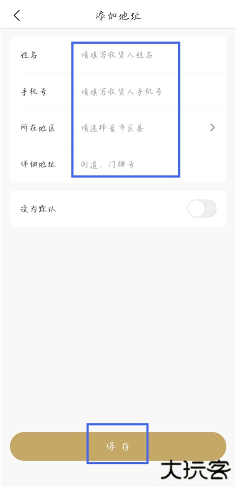 3、填写姓名、手机号以及地址信息,点击保存即可。