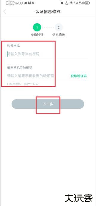 3、需填写账号当前密码及短信验证码,点击下一步。
