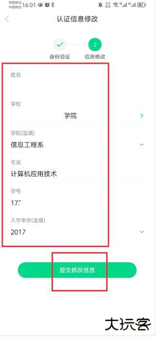 4、最后将正确的学校名称、学号等信息完善后点击提交修改信息即可。