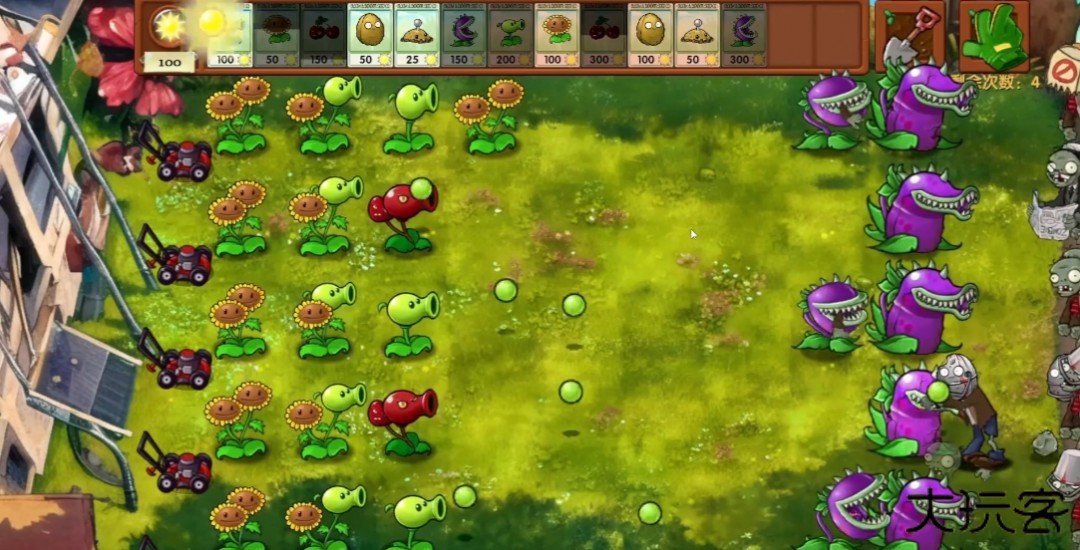 操作:前排窝瓜控场,后排豌豆触发火焰风暴清屏,小喷菇应对特殊环境