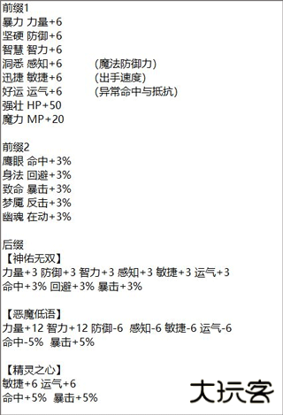 * 稀有词条特性:* 恶魔提供高额伤害但会降低命中和双重抗性;神佑提供大量属性加成;精灵提升暴击和命中能力。