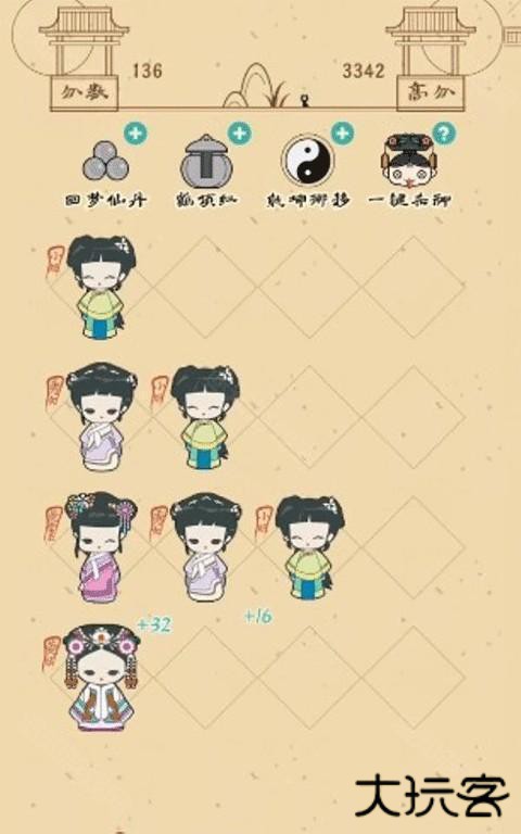 1.手指简单的点击或滑动屏幕,即可将相同等级的宫廷软妹聚在一起,初入宫闱的小秀女将一个一个地在你的指尖成长为一代皇后。