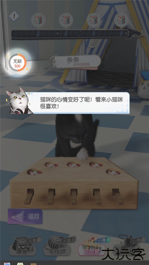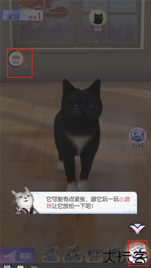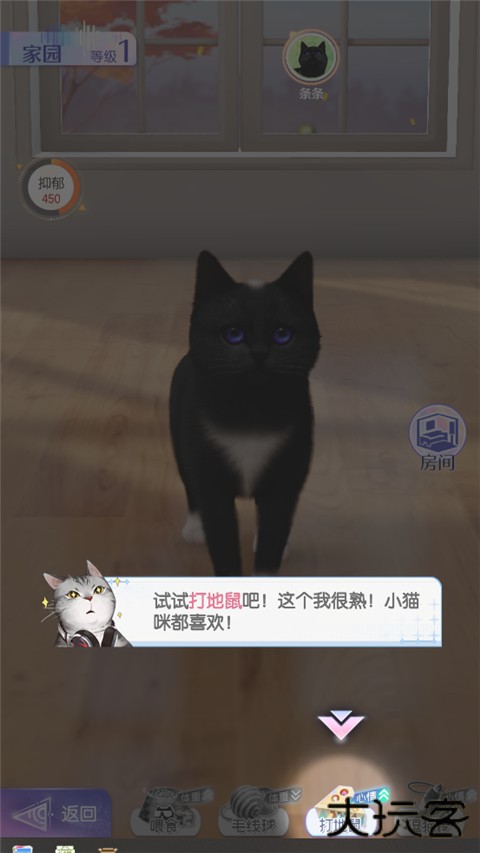 8、初入新家,猫咪心情值较低,我们点击游戏,让它放松一下;