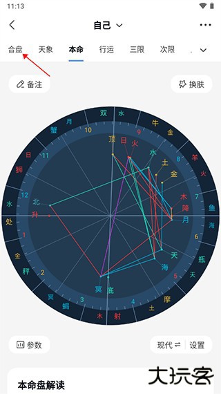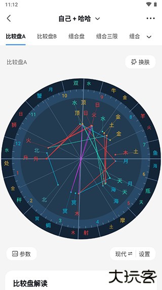 4、就能进行合盘,合盘之后即可看到自己和对方的星座参数解读等。