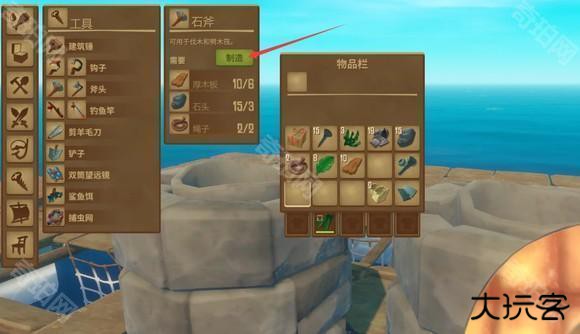 2、灵活的运用各种工具来实现想法,其中包括渔网,鱼钩和铁锤等,大面积的收集资源和加快建造速度