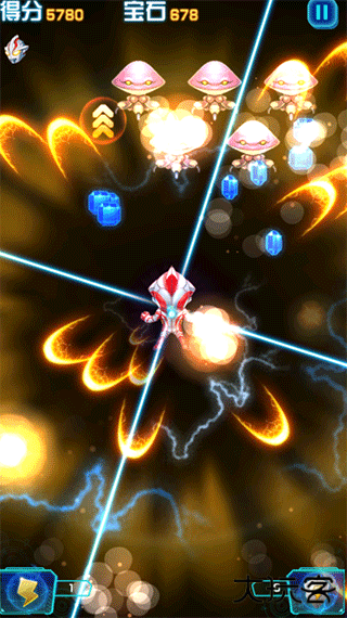 2、游戏呈现出华丽的弹幕设计与史诗感场景。弹幕效果汲取了经典雷电系列的设计精髓,背景主题深度还原 M78 星云的设定,配合动态光影技术,成功塑造出融合科幻元素与奇幻氛围的沉浸式体验。