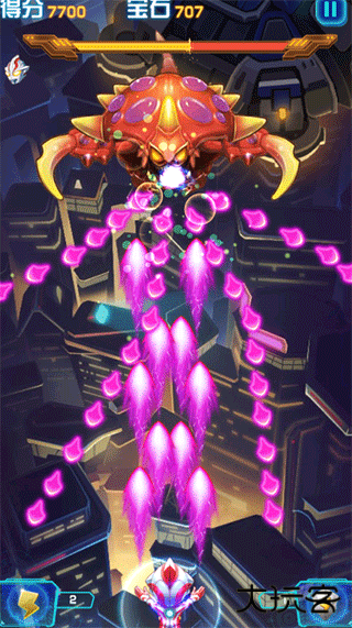 1、游戏机制融合极简操作与硬核技巧。采用经典的屏幕拖拽移动控制模式,操作易上手。首领战中需精准把握能量值蓄力及释放时机以实现有效打击。