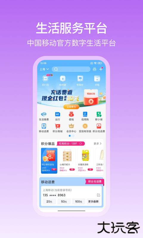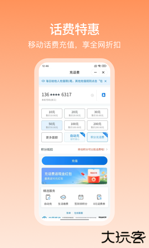 4、话费流量充值:移动话费充值享全网折扣,支持流量包购买及自动续费功能。