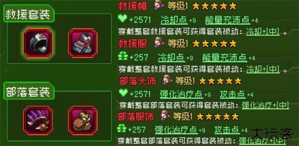 【部落套装】(全套):获得 “强化治疗 +【中】” 效果,并中等幅度提升友方攻击力。配合群体治疗武器,可令队伍攻击力增幅状态覆盖率高,降低通关难度。