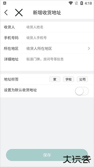 4.进入新增收货地址界面,输入收货人、手机号码、地址标签等,然后点击保存即可