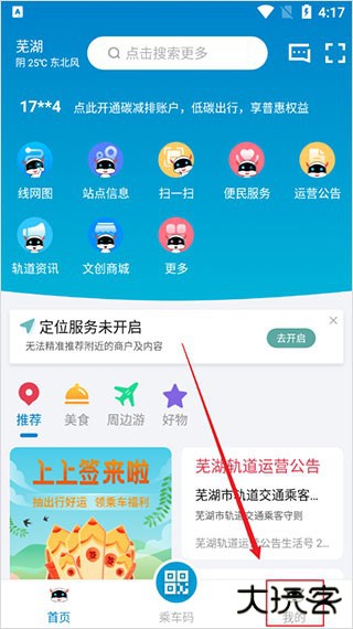 1.下载并安装芜湖轨道app,完成后打开软件进入首页后,点击我的选项
