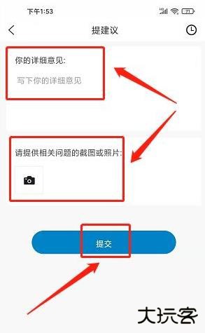 3.进入提建议界面,输入详细意见内容、上传相关问题的截图或照片,然后点击提交选项
