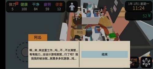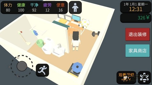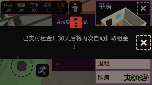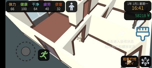 4、当资金积累达到 1000 元时,就可以考虑租下第一套属于自己的房子了。本作延续按月支付租金的设定。拥有固定住所的最大意义在于可以购置家具,从而解锁更多赚钱方式。因此,付出这 1000 元作为启动资金是十分必要的投入。