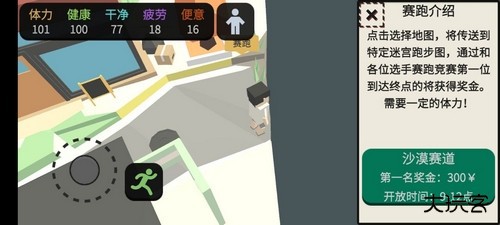 1、游戏初期,玩家会发现新增的跑步功能。位于左侧方向键旁的图标,就是跑步与行走模式的切换按钮。点选后,角色在地图上的移动速度会明显加快。但需要留意,跑步会极快地消耗体力值。在游戏前期,体力主要用于打工赚取金钱,萝卜建议此时尽量控制使用跑步功能的频率。