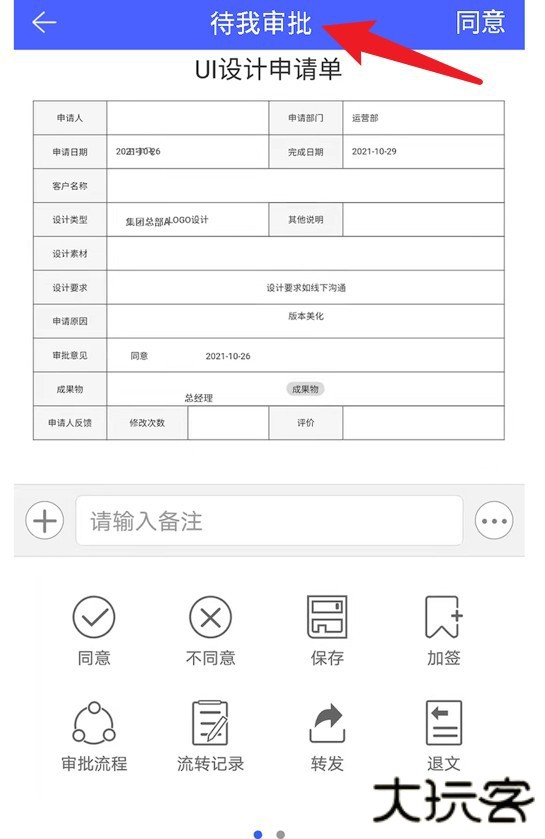 3、在“待我审批”中可查看并处理需要自己审核的任务,支持审批意见填写与多种操作。