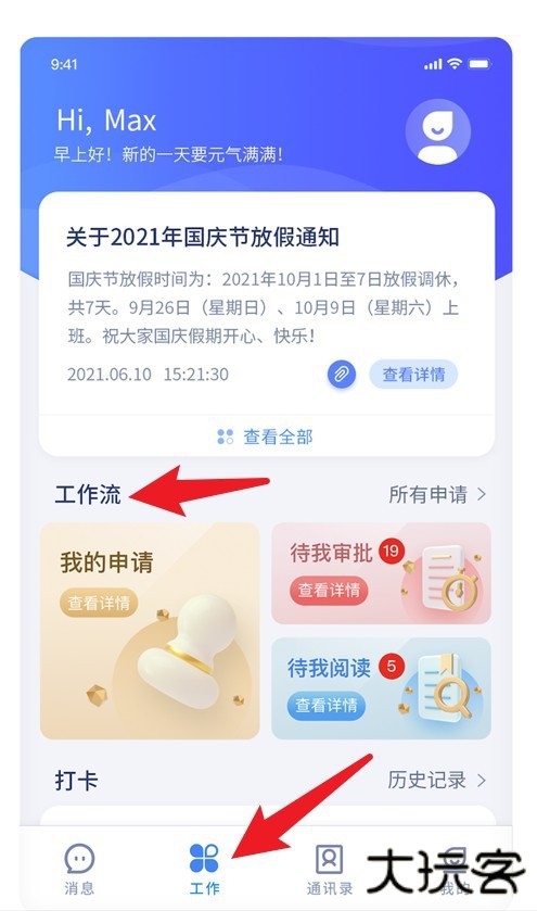 2、首页界面展示待办提醒与流程入口,点击“工作”按钮可进入各项业务模块处理。