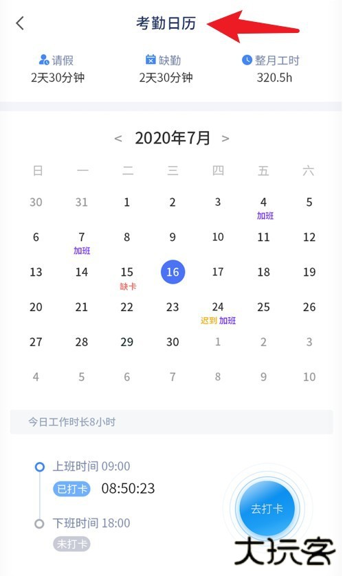 5、考勤日历界面直观展示出勤情况,含加班、缺勤等记录,可点击“去打卡”完成操作。