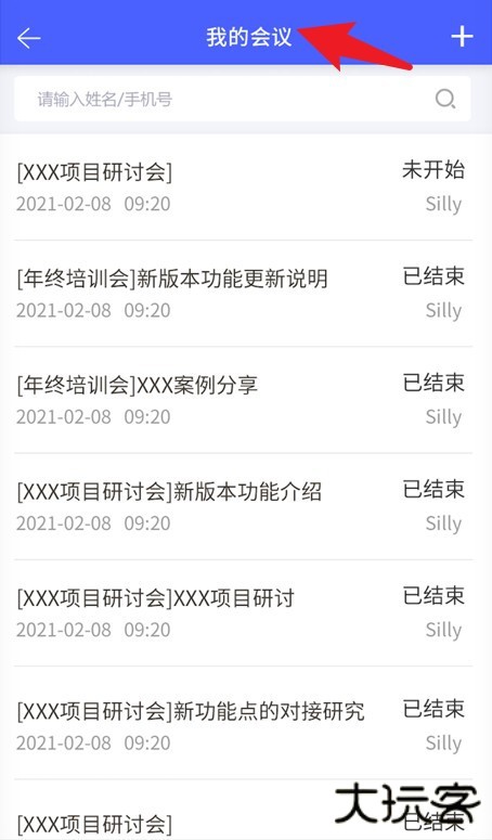 4、“我的会议”页面列出所有会议安排,点击右上角加号可创建新的会议并设置时间。